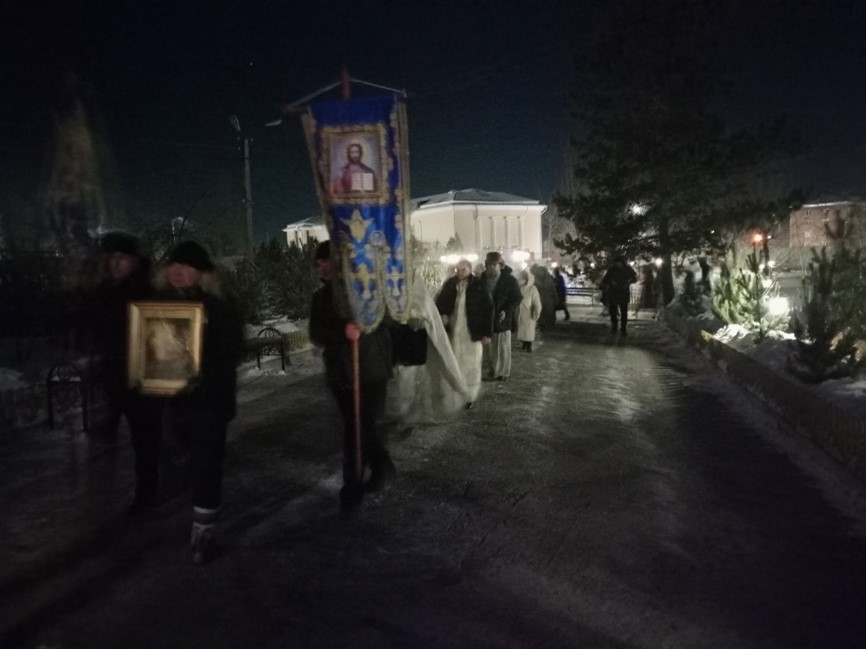 Всенощное бдение в празднично украшенном храме началось в 24 часа. Протоиерей Евгений возглавил совершение литии, а на Утрени помазал всех молящихся освященным елеем. Был прочитан канон праздника.