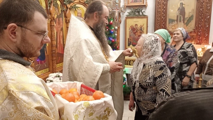 Подходя ко кресту в завершение праздничного богослужения, каждый его участник получил в подарок «рождественскую» мандаринку.