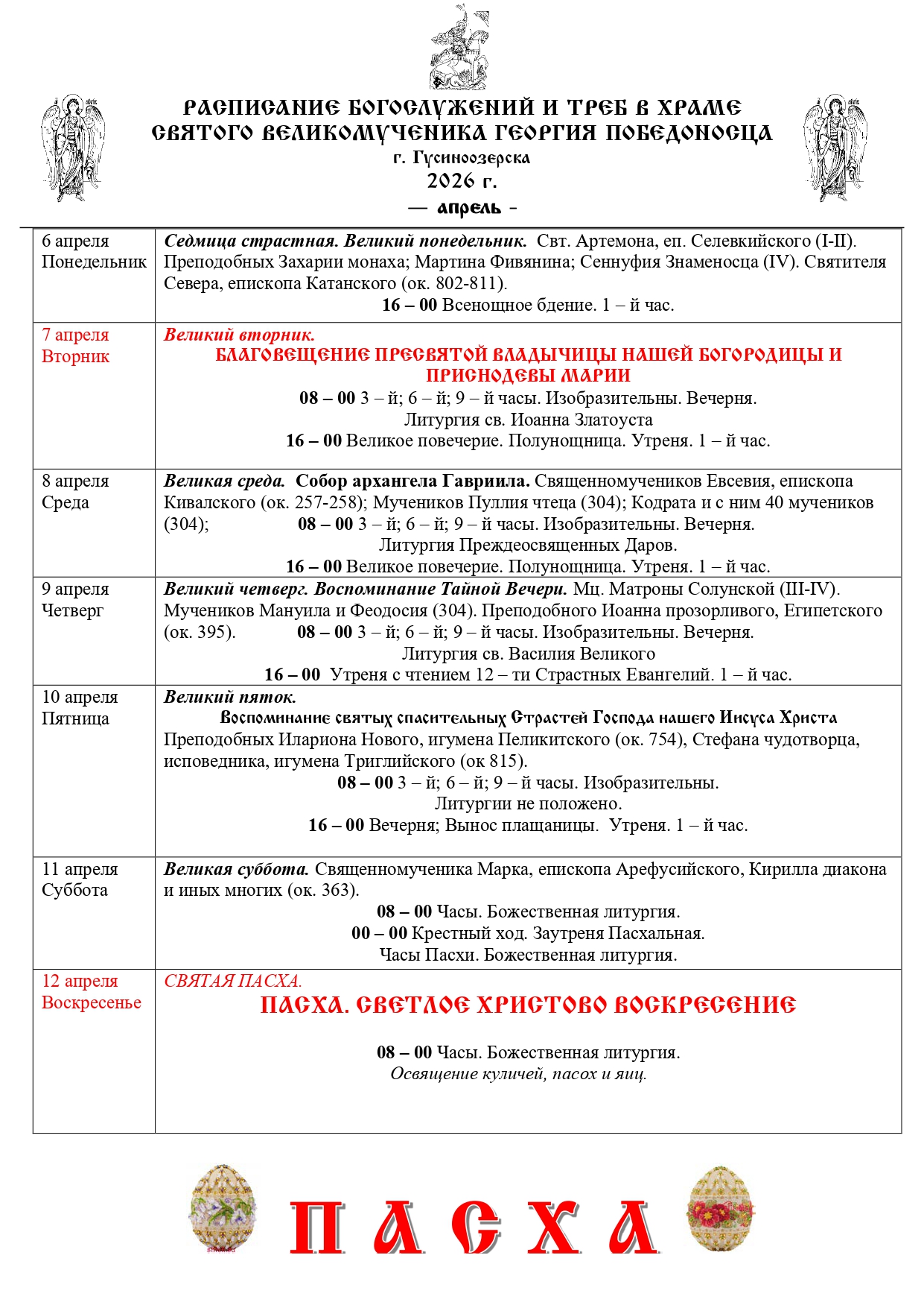 РАСПИСАНИЕ БОГОСЛУЖЕНИЙ И ТРЕБ В ХРАМЕ - АПРЕЛЬ -